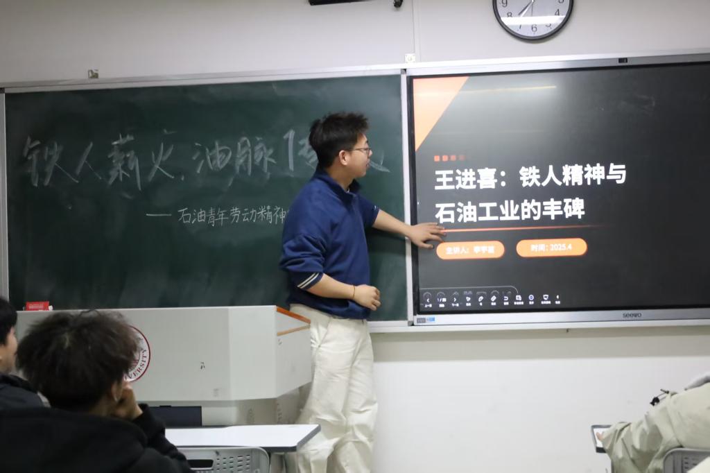 活动中,董安琪、李宇堃、周金勃、朱伟华四位同学分别通过不同角度讲述了“铁人”王进喜的事迹,包括他带领工人用人力搬运钻机、端水打钻、跳进泥浆池制服井喷等壮举,这些事迹背后无私奉献和热爱祖国的精神内核对我国石油工业的深远影响。不仅如此,同学们还介绍到新时代石油人如马庆、胡晓健,用智慧和创新续写石油工业的传奇,以及李四光、王德民、等人物对石油工业的影响。