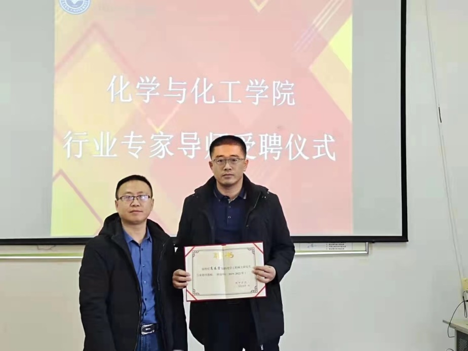 首先,化工院副经理王爱民教授代表化工院为研究生行业导师高春雷颁发聘任证书。高春雷工程师表示很荣幸担任化工专业硕士生行业导师,对公司三推一培养模式表示肯定,谈到自己作为行业导师将从工程问题出发指导员工,做到理论实际相结合。