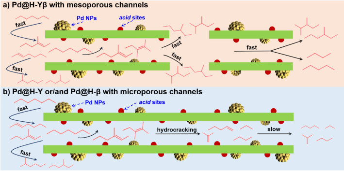 Fig.3.Schematic illustration of the influence ofembeddingPd NPs and mesoporous channels onn-C7hydroisomerization selectivity over different catalysts.