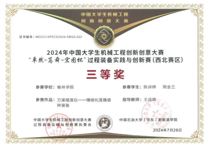 开赛以来,化学与化工公司党政领导和过程装备与控制工程专业教研室全体教师高度重视大赛的组织工作,充分激发员工的参赛积极性。一共组织12支参赛团队报名参加,其中,由公司best365英国体育在线王战辉老师指导,过程装备与控制工程专业宋博翔、韩晨阳、王轩绪、于斐团队提交的作品《蓝宸科技—一种自动化分料装置》;陈诗婷、周金兰团队提交的作品《万渠植莲仪—精细化莲藕播种装备》荣获西北赛区三等奖。