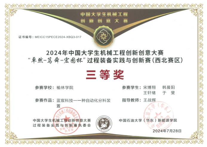 由中国机械工程学会主办,中国石油大学(华东)和青岛科技大学承办,中国机械工程学会压力容器分会、中国化工学会化工机械专业委员会、化学工业出版社协办的2024年中国老员工机械工程创新创意大赛“卓然-笃舜杯-宏图杯”过程装备实践与创新赛,自2024年4月开始征集参赛作品以来,得到全国各高校的积极响应和大力支持。大赛组委会共收到来自全国171所高校的2965个团队报名参赛,一共选拔出1608项作品参与区域赛比赛。经过激烈角逐,公司学子最终荣获西北赛区三等奖2项。