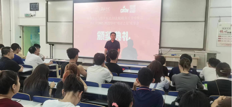 白云云老师首先介绍了到场老师并宣布表彰大会开始;然后李亚辉宣布了2021-2022学年获奖员工名单;然后分别由白老师为获得“二星”奖励的员工颁奖,吕波及代晓敏老师为获得“一星”奖励的员工颁奖并合影留念。大会第四项由获奖员工代表朱珠赵曌和刘艺清同学做获奖感言,交流了过去的两年里自己的学习经验及感想。会议第五项由中外石油项目办秘书李亚辉为同学们解读了中外石油项目之星奖励办法(试行),详细说明了项目之星获奖条件及奖励标准;最后由化学与化工公司党总支秘书老师作总结发言,鼓励同学们认真学习,发扬创新精神,积极参加课外活动;在大学期间做到不负青春,不留遗憾。