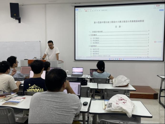 在本次特训中,石油工程教研室张皓宇老师对《第十四届中国石油工程设计大赛方案设计类赛题基础数据》进行了讲解,深入解读了综合组的区块概况、地质特征、气藏特征以及单项组的油藏工程、钻完井工程、采油气工程、地面工程的数据类型以及应用方法,有针对性的对公司学子们进行了专业软件辅导以及专业知识补充。
