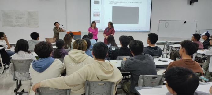 北方联邦大学教师奥莉加与奥莱斯亚向同学们介绍了阿尔汉格尔斯克市及其历史和独特的北方色彩,以及北方(北极)联邦大学的教学情况、活动和基础设施,并对同学们的入学表示祝贺,翻译老师伊艳梅为同学们作同声翻译,并分享了俄语学习经验。